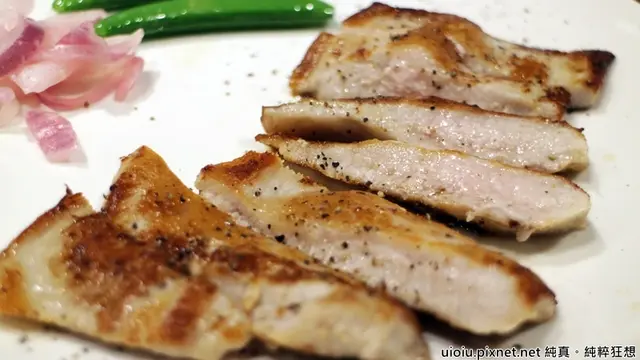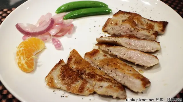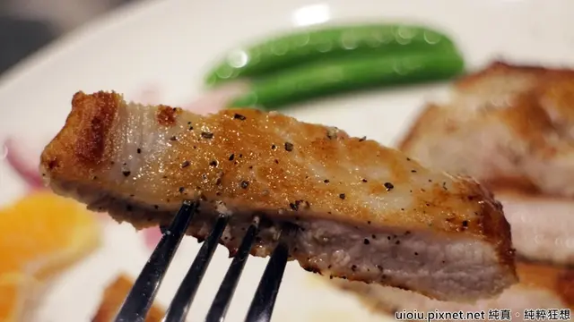 有沒有覺得豬肉的紋路很眼熟?是的,這就是俗稱松板豬的部位,一般鐵板燒松板豬肉量都不多,但莉格給的份量算蠻多的,用的是義大利進口松板豬肉,厚度上也很有誠意,吃起來口感脆脆的,很有咬勁,只有灑上胡椒提味,原味就很好吃,但沾上一點玫瑰鹽滋味又不同囉!