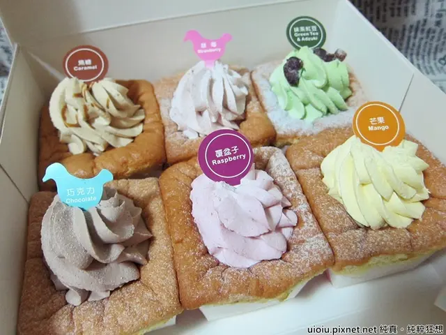 綜合聖代戚風蛋糕每種口味都各一個,很難選擇要吃哪一個,只好全部都我吃掉(咦!?),每一款的基底就是牛奶戚風蛋糕,再加上各種口味的鮮奶油,覆盆子口味有著淡淡的莓果香氣,酸酸甜甜的,爽口!抹茶紅豆口味有著蜜紅豆般的紅豆,不愛吃紅豆的我也覺得紅豆吃來甜而不膩,抹茶鮮奶油抹茶味不濃,帶著淡淡的抹茶香,吃來也不會膩,芒果口味拿去冷凍後冰淇淋的口感吃起來好夏天呀!芒果不虧是夏天馬上就會聯想到的水果呢!巧克力口味感覺中規中矩,希望可以再降低甜度,這樣搭上鮮奶油會覺得更爽口!焦糖口味到是讓我小意外,本來以為會很甜其實不然,是一種一絲絲的苦味提出甜味,原來焦糖也可以這麼不同!草莓口味讓少女心爆發呀!草莓不管是酸還是甜都一樣美味咧!