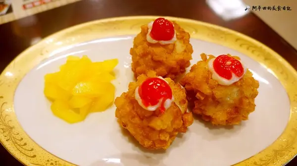 御膳房的招牌菜之一,現點現做,以蝦球、蝦膏製成,外層再裹上吐司丁,再以高溫下去由炸,炸得金黃酥脆,口感非常扎實,一定要趁熱吃才好吃,上面再用美乃滋加櫻桃點綴,而一旁黃色的配菜味道超特別的,酸甜酸甜的,猜了好久,一問之下才知道是百香果醬醃製的冬瓜...夏天吃超適合的!