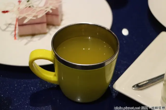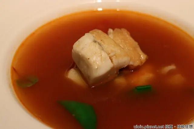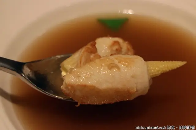 將多種海鮮與蔬菜烹調而成,湯料有如藝術畫般優雅的展示在湯碗中,引人注意的是那片透明湯料,原來是白酒蛤蜊凍!淋上海鮮清湯後就看到白酒蛤蜊凍慢慢融化...感覺很像是一場小小的桌邊秀呀!