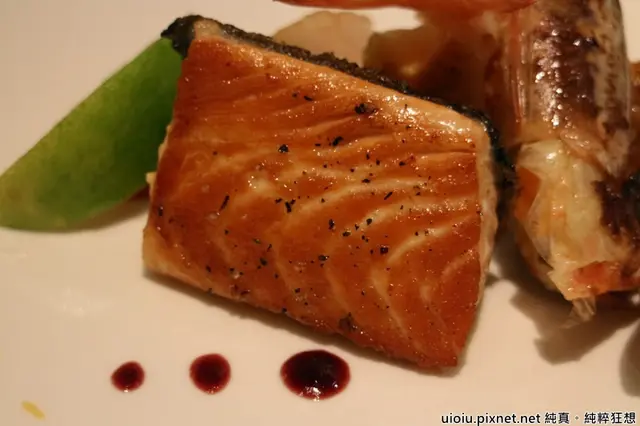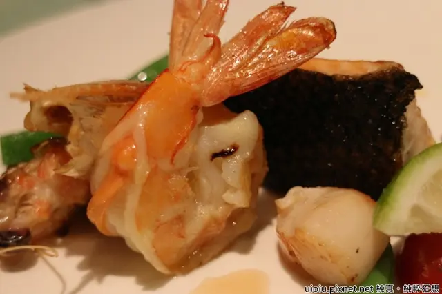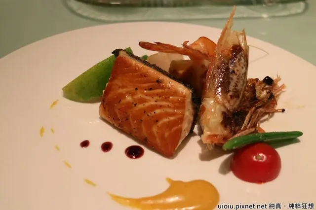 主餐之一:澳洲紅刺蝦、挪威鮭魚、北海道生食級干貝,不僅食材嚴選,擺盤也不馬虎呢!