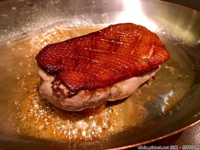 在鐵板上慢火煎出金黃誘人的鴨皮後,再加上可可香甜酒點火烹調,將肉汁鎖入肉中,使酒的香氣依附在表面,