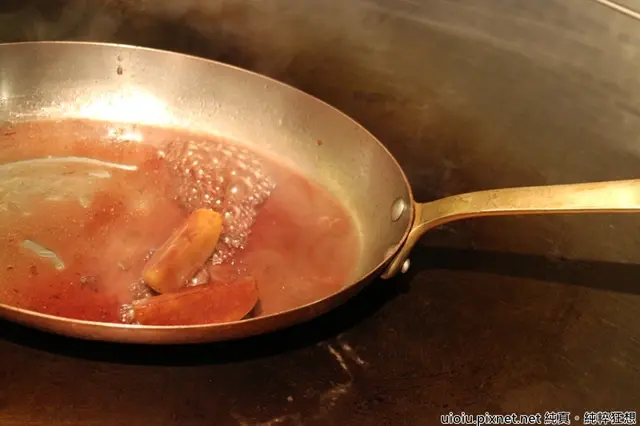最後加入紅酒與主廚特製醬汁熬成蘋果紅酒醬汁,