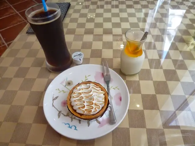 附餐的冰咖啡和芒果奶酪,檸檬塔是另外點的
