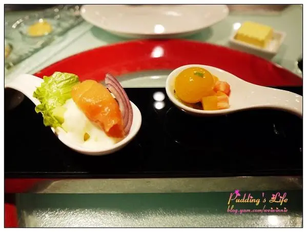 開胃菜--煙燻鮭魚蘋果酸豆、芒果晶球水果沙沙