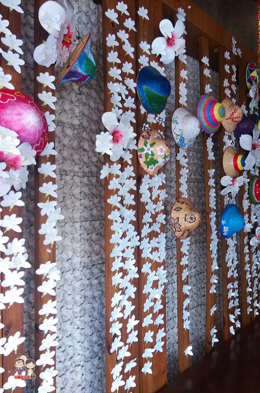 滿牆的桐花、客家花布與斗笠所串成的牆面,