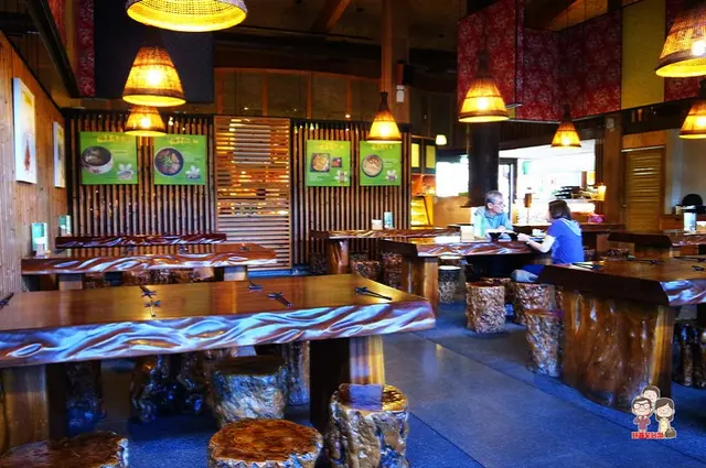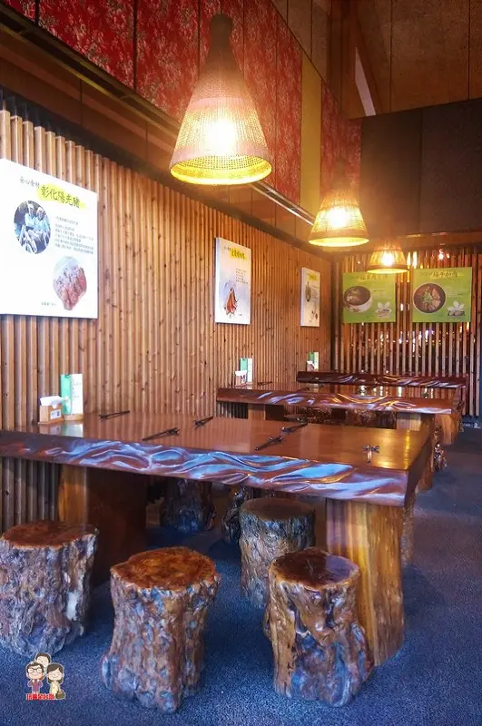 原木的餐桌椅,充滿著客家山成的氛圍,