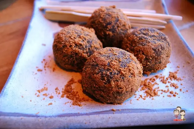 這是招待的麻糬,與眾不同的外觀,像是裹了黑糖在上頭一樣。