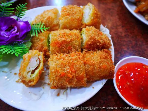 沾料是泰式甜辣醬,這一道普通,餡料是包了類似花枝漿的東西和脆脆的蔬菜