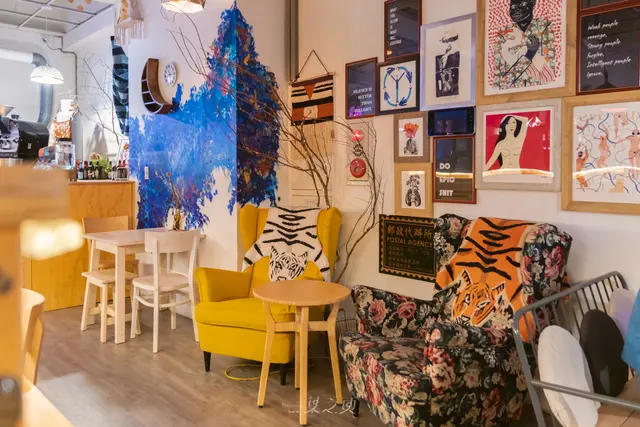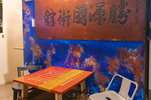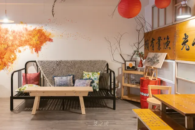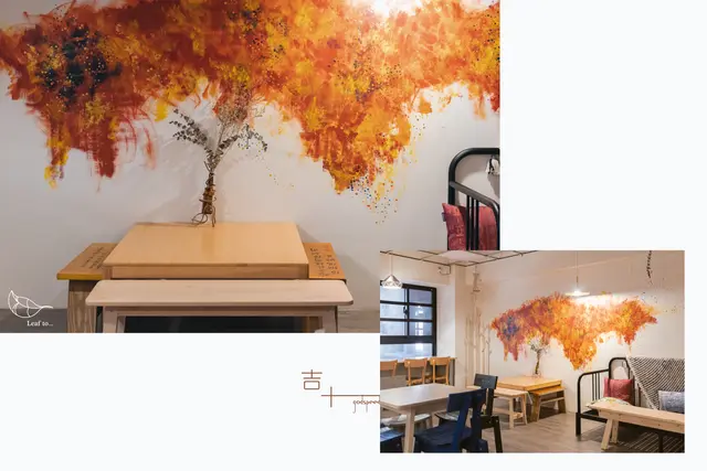 老實說,現在流行的咖啡廳,大多喜歡有大片採光、簡單明亮的風格;吉十咖啡店內空間所呈現出來的樣貌幾乎背道而馳:店內和大門門板一樣沿用了許多匾額製成的桌子、板凳等家具;喜歡畫畫的甜點師除了在各處放上自己的畫作之外,在牆面上也潑灑了大面積的作品。