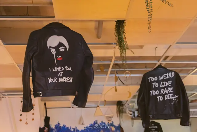 平常還是輕檔車車友的兩位主理人,除了在店門口停放著自己的愛車之外,天花板上還掛著一些自己騎車時會穿的皮衣外套收藏,皮衣上寫著頗有意思的標語:「Be a voice, not an echo.」