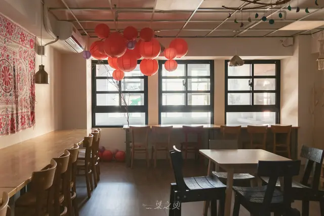 二樓空間延續了一樓的風格,同樣使用了許多匾額製作桌椅和牆板等、同樣在牆面上可以看見甜點師的畫作。而我喜歡二樓窗戶灑進的陽光,還有天花板上掛著成簇如花叢的大紅燈籠。