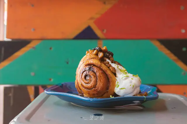 第一個嘗試的,便是以丹麥麵包作為基礎的丹麥肉桂,和平常吃到柔軟麵包口感的肉桂捲不同,而是有著丹麥麵包像是千層派一般的酥脆口感,肉桂氣味不會過於刺激,和淋在上頭的特調糖霜相互襯托,兩者的香氣在口中都凸顯但柔和。