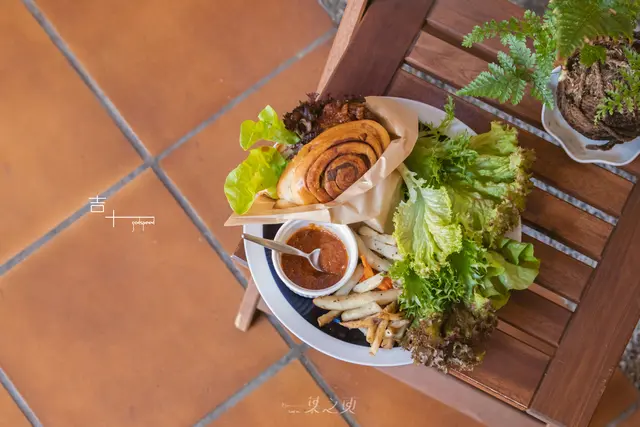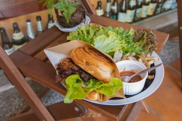 在參考吉十咖啡的菜單時,因為洋洋灑灑、品項眾多,其實自己是有點狀況外的,僅收到是有提供鹹食的資訊,並未再特別著墨;直到當「吉十特餐」上桌時,真的讓我感到特別驚喜:看起來像漢堡的主食,麵包部分也是肉桂捲!