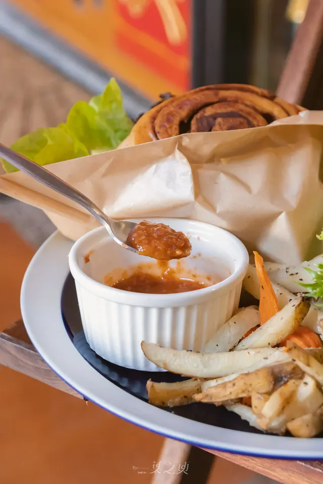 特餐裡頭搭配的沾醬,有起司泡菜紅醬、番茄紅醬、蜂蜜芥末醬、花生甜辣醬等多種沾醬可以選擇,而吉十咖啡推薦給我的,則是自己覺得最具特色的花生甜辣醬。