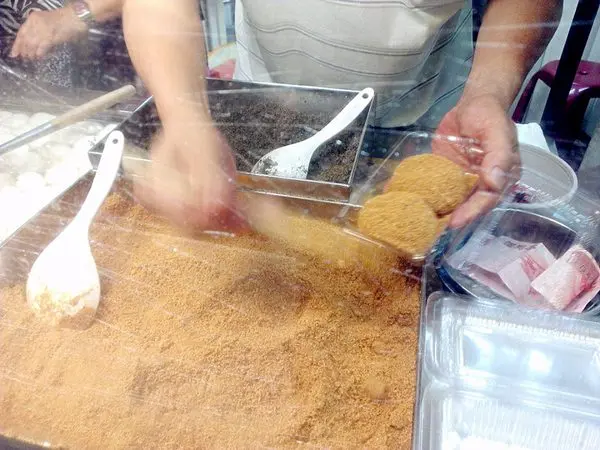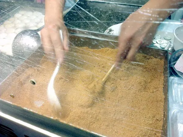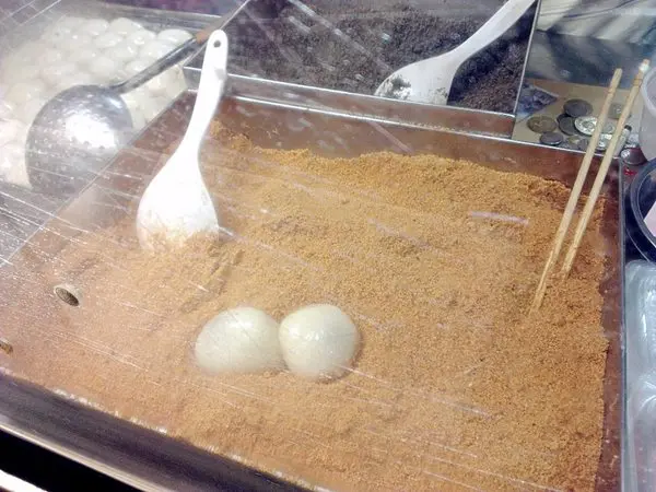 從水中舀起兩顆麻糬(一份兩顆)放入一旁的花生粉中
