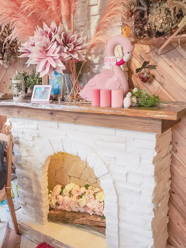 連壁爐的四周也布置了許多花藝品,粉粉嫩嫩,令人心花怒放。