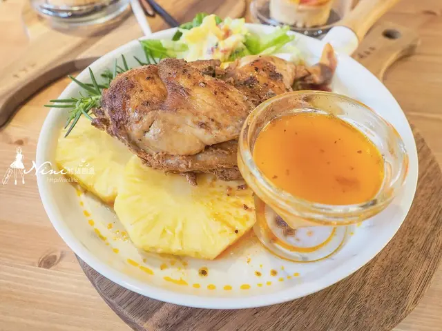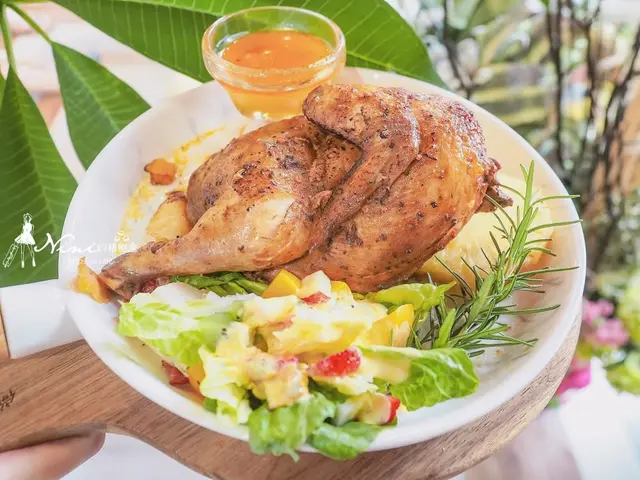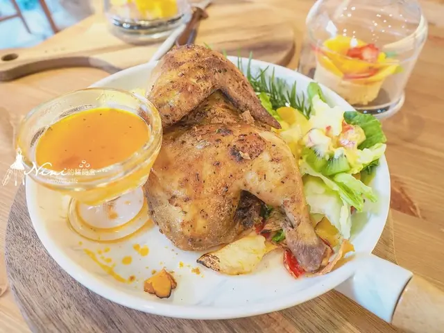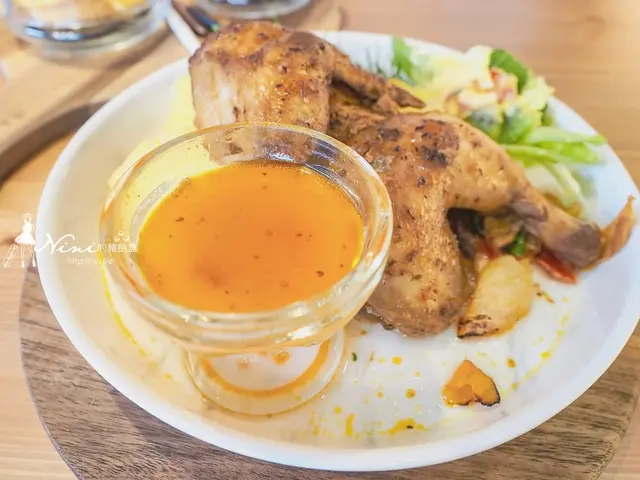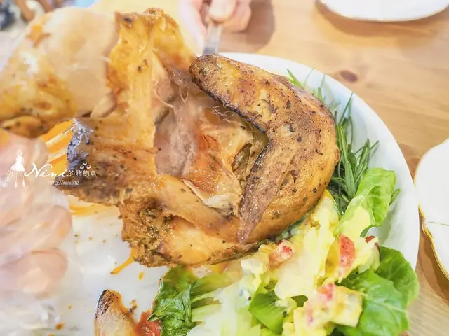 烤香草雞份量半隻,擺盤融入花藝,給人清新的感覺,光瞧就食慾大開了。