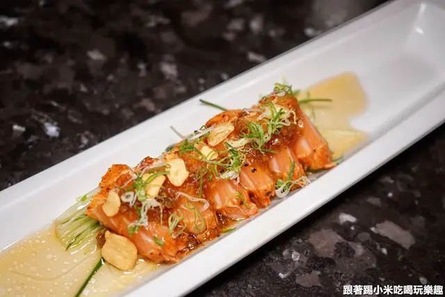 義式生醃鮭魚片280元,是一道創意結合義式+日式的開胃菜料理,在鮭魚生魚片上淋上特製義式柚子醬,在一口吃的時候柚子醬的酸V帶出鮭魚的甜味有兩種不同層次的味道享受 而鮭魚的邊邊有稍為炙燒帶一點魚香的脆度,再配合軟嫩的口感非常棒