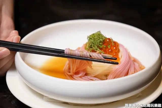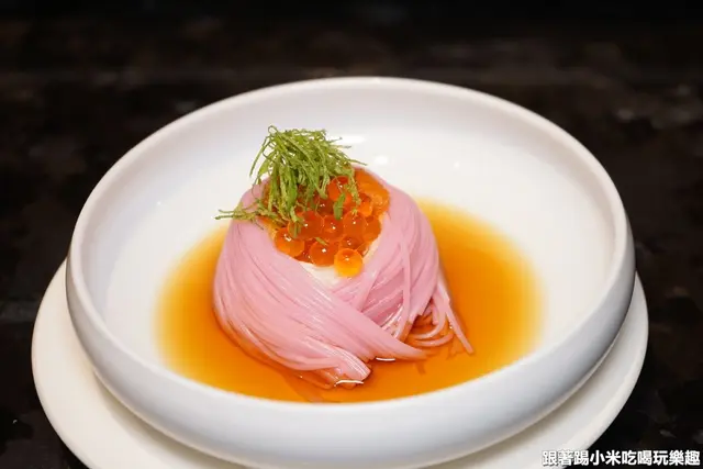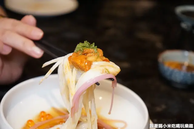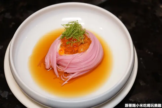 海膽花枝鮭魚卵梅子細麵(280元),是一道美美的開胃前菜