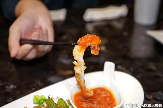外層是梅子細麵,因為梅子的關係麵條才會帶上帶紅的顏色,軟嫩細滑的麵條口感非常棒,沾上帶點酸V清爽的醬汁很好吃