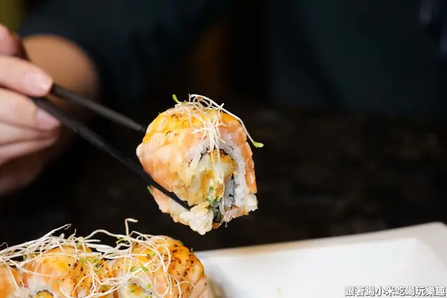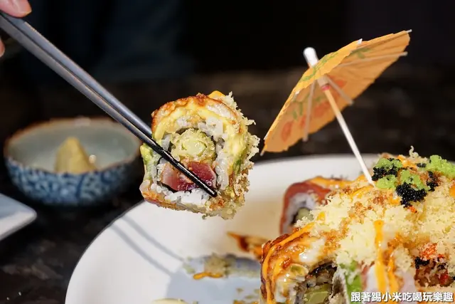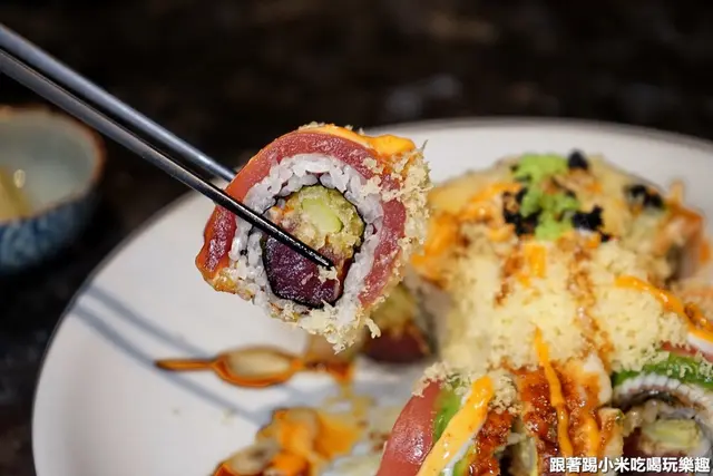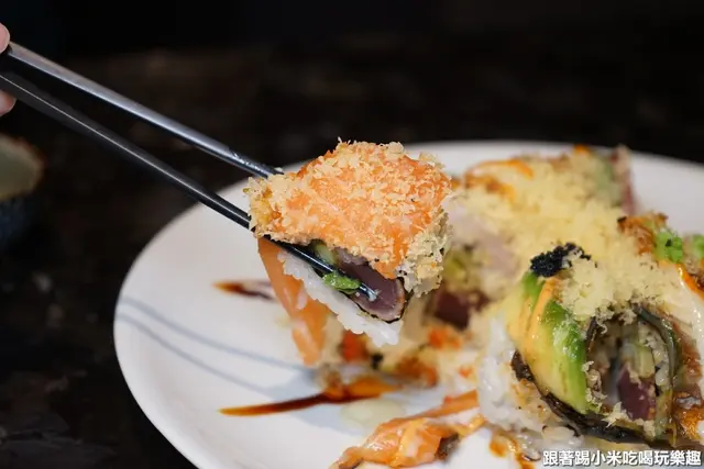 不只是外面有生魚片而已,裡面還有夾著炸物及生魚片,配上軟Q的醋飯,所以從外到內可以感受到軟嫩+酥脆的口感,當然魚肉鮮甜用不著說讓人很滿意