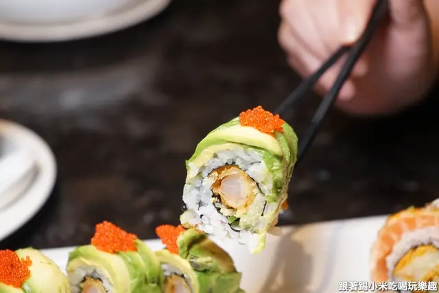 對了,綠色的是酪梨水果,口感上軟軟的跟生魚片很像,可以說是生魚片的水果版,跟魚肉搭著吃不會有違和感外也讓這道壽司捲多了一分清爽的感覺