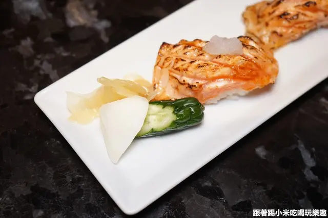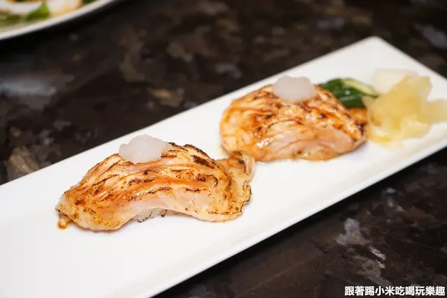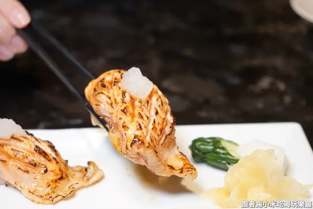 炙燒腹膜握壽司(1貫90元),炙燒過的鮭魚有香氣又有油脂甘甜的美味盡在裡頭~軟嫩的鮭魚可以說是入口即化,再配軟Q的醋飯會想讓人再來一貫><