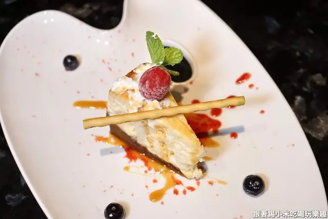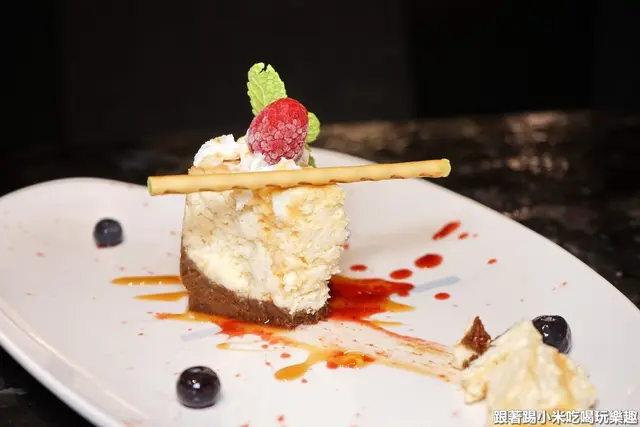 最後的甜點紐約風味起司蛋糕(180元)光擺盤就很吸引人了,而且是他們自己手工製作,不是批回來的XD 上層是軟綿又濃郁的鹹香起司蛋糕,底層是鹹酥有脆的塔皮,跟起司蛋糕搭著吃太美妙了