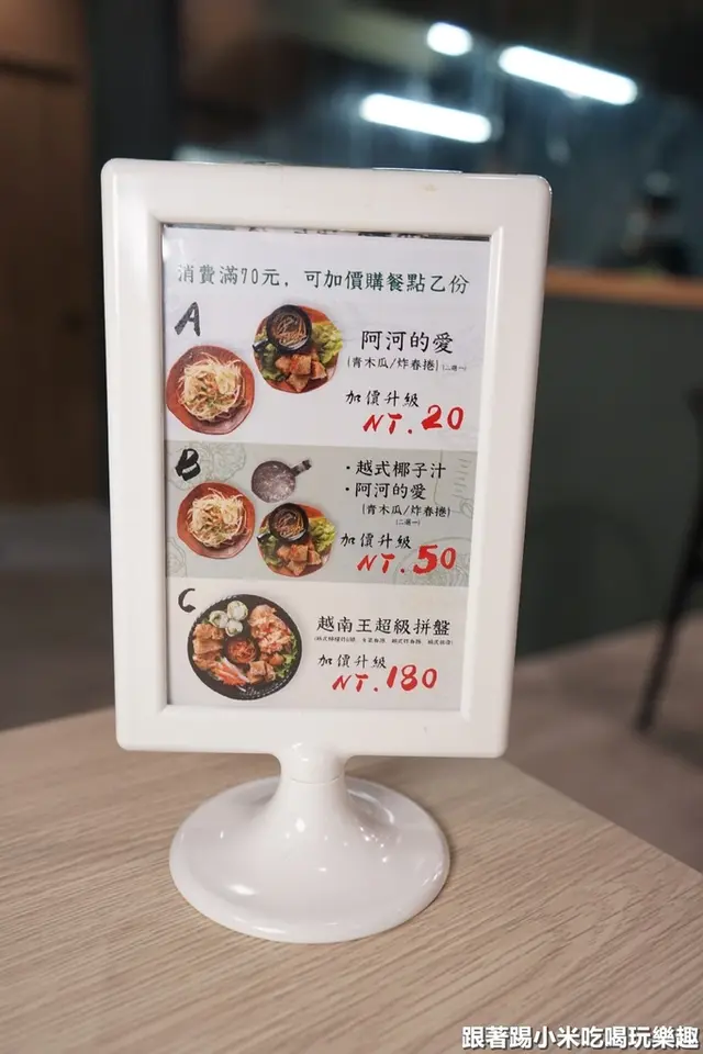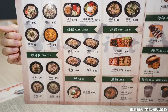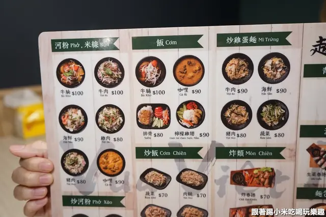 來看看菜單吧,主餐皆是100元或以下,屬於平價的越南料理,有河粉.飯.炒雞蛋麵.炸類小菜等,很適合上班族或學生來這裡用午晚餐。