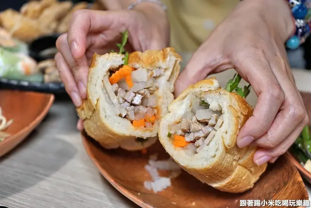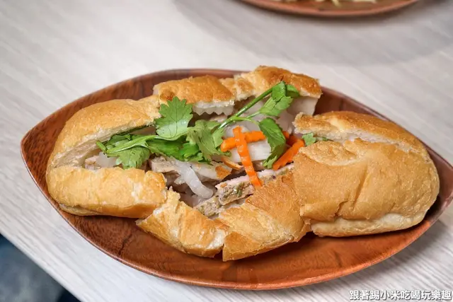 法國麵包70元,有越式排骨.扎肉.醃漬物蘿蔔等,法國麵包有烤酥酥的有外酥內軟的口感,夾著肉肉吃還不錯吃,如果覺得太乾的朋友可以加一些越南醬料一起吃,或是點咖哩麵包,法國麵包沾咖哩也蠻搭的唷
