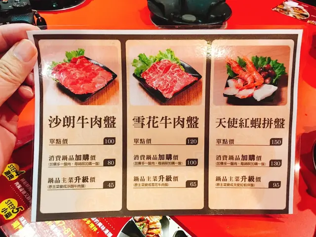 如果想吃好一點的肉品, 可以加價換成沙朗牛或雪花牛肉. 像這個是可以升級主菜為雪花牛只要65元, 或主鍋加購一盤才100元. 漂亮色澤及雪花油脂好吸引.