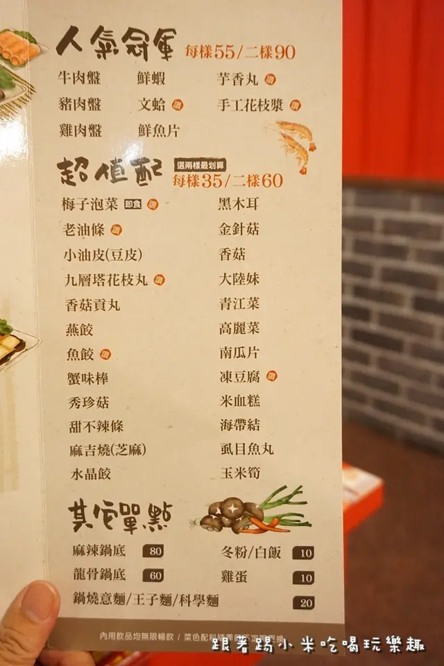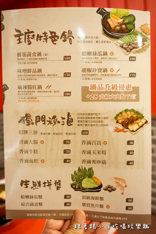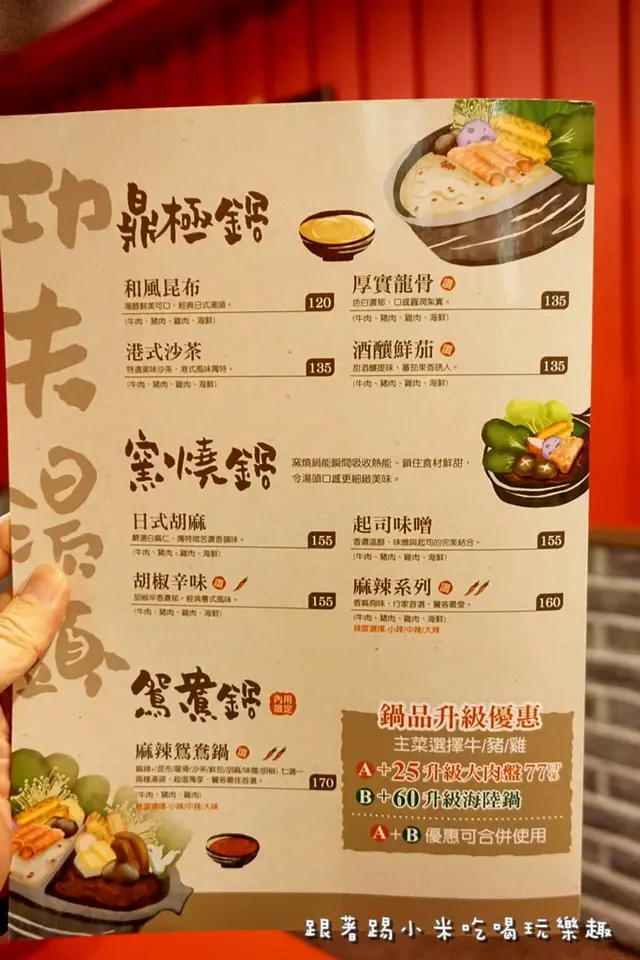 來看一下菜單吧, 鍋品是120元~180元之間, 有不同風味鍋底, 有辣有不辣, 也有清爽或重口味, 選擇性蠻高的~ 其他還有一些單點滷味及火鍋料, 肉盤及火鍋料搭配兩樣一起點會更划算唷. 如果有點鍋品只要+25元就可以升級兩倍肉, 比單點一份肉來得划算, 喜歡吃肉的朋友別忘記了XD