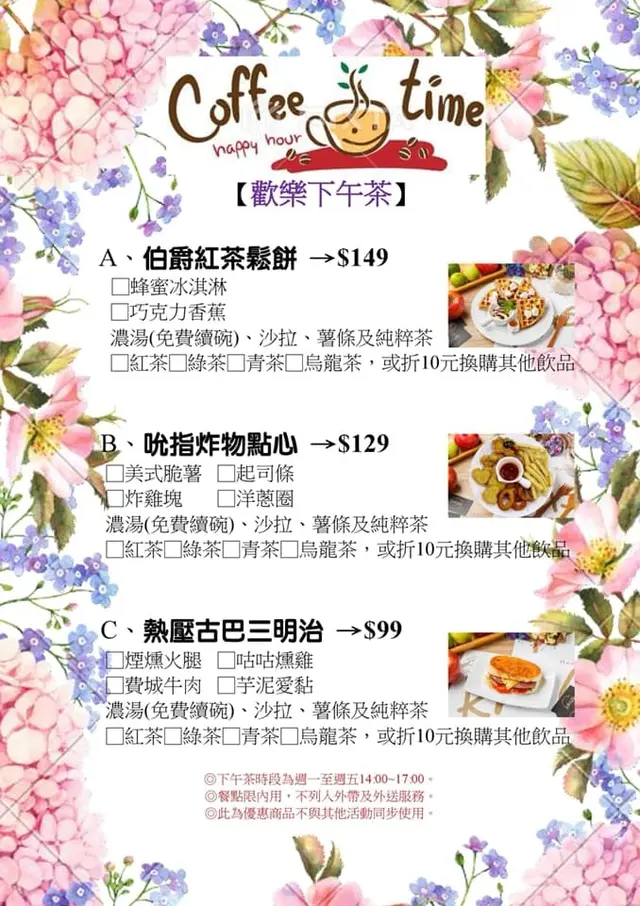 好啦,回歸主題來看看菜單吧,有飲料及輕食兩種主類可供選擇,飲料有清茶.水果茶.奶蓋等,個人很喜歡他們的奶蓋系列的鹹甜口味,特別是有紫芋口味深得我心啦~其他還有古巴三明治.炸物.義大利麵燉飯等,是走平價的路線。