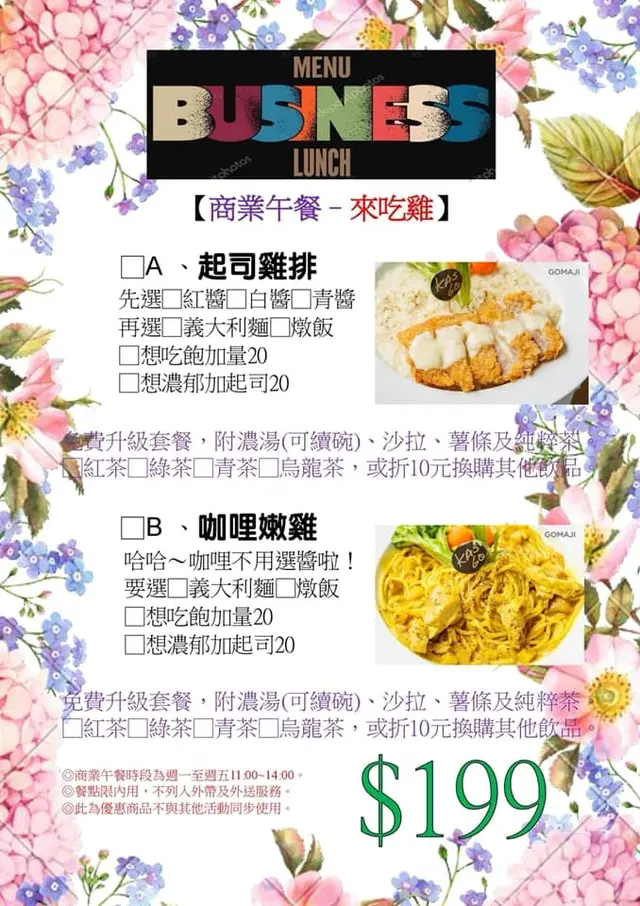 他們有三種129(奶油炒培根/綜合菌菇/日式照燒雞球)元義大利麵(燉飯)可供選擇,加麵是加20元 必定是小資族及學生最愛
