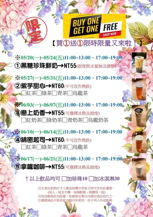 來推一下這兩杯水果茶70元及黑糖珍珠奶蓋55元,有現成的真花花牆當背景拍照美美滴