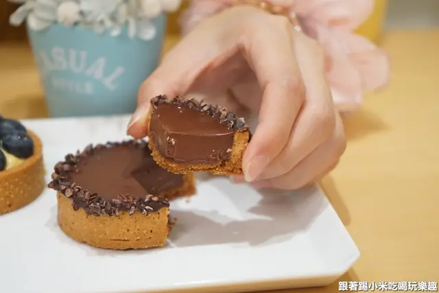 巧克力塔(130元),中間的巧克力內餡是由鮮奶油與加勒比巧克力的融合,吃起來有奶油香的苦甜巧克力的傳統滋味 順滑的生巧克力在嘴巴裡融化的感覺是非筆墨能形容,巧克力控的朋友記得來嚐嚐看