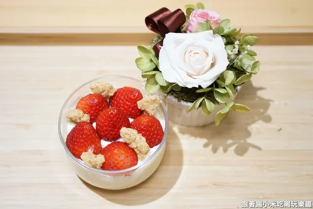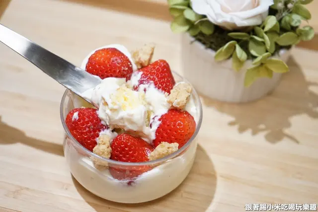 草莓聖代裡面有綿密的蛋糕體,結合甜而不膩的奶油就會讓人停不下來一直挖>< 再配上鹹酥的餅乾及酸甜的草莓又是一個少女殺手級的甜點了