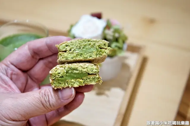 抹茶達克瓦茲(60元),這是來自法國西南部地區的甜點,由大量的蛋白及糖粉所做出來的蛋白餅,外層是帶點酥脆裡面卻是軟綿輕盈的特殊口感,內餡使用一保堂抹茶粉製成的巧克力,甜而不膩是小貴婦的享受