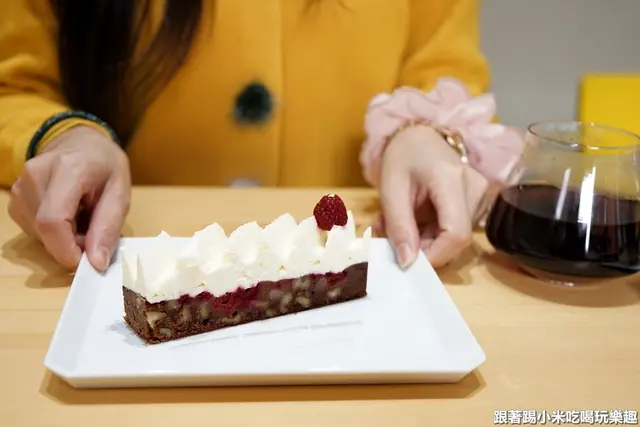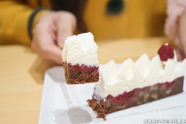這是切片蛋糕覆盆子巧克力布朗尼150元,另外還有生日蛋糕造型的出售,選用麥卡倫1824紅標威士忌,刷在布朗尼表面與鮮奶油當中,甜而不膩的鮮奶油跟帶酒香的布朗尼結合一起吃是不同層次的口感享受