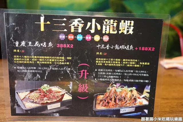 第一次來的朋友當然要先來一份重慶辣豆花烤魚(芙蓉魚)388元X2(2人份),另外只要每人+188元(*2)就會有十三香麻辣小龍蝦(1斤)。(超過兩人食用每位+10元)