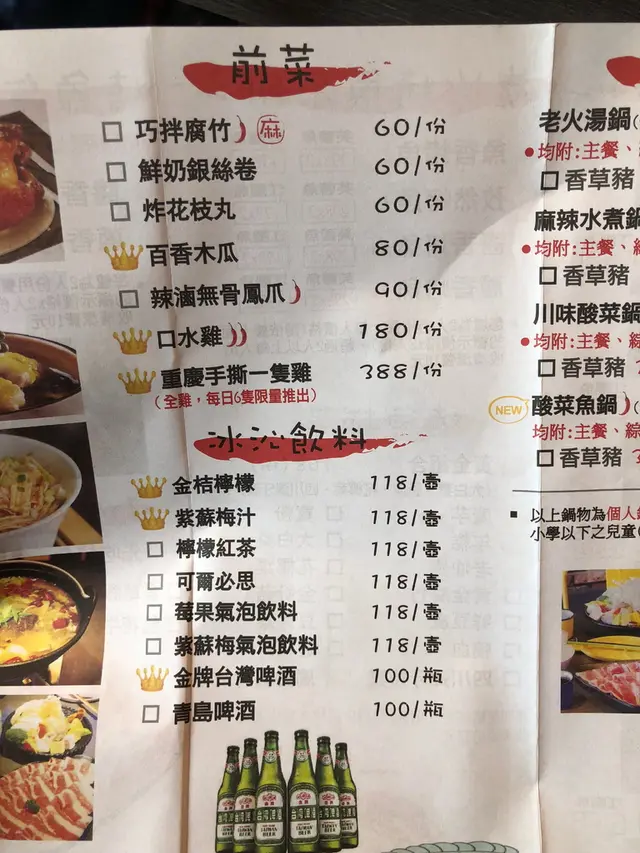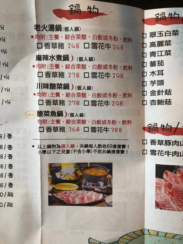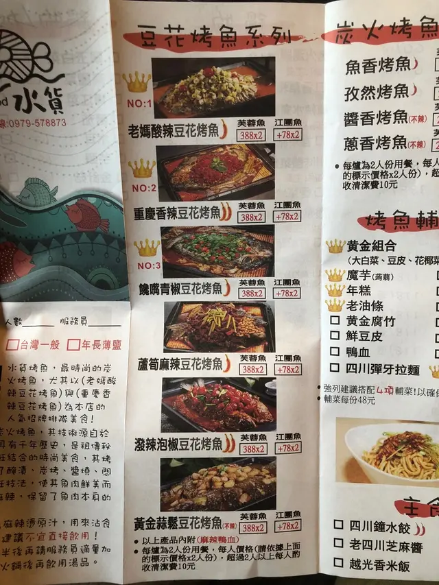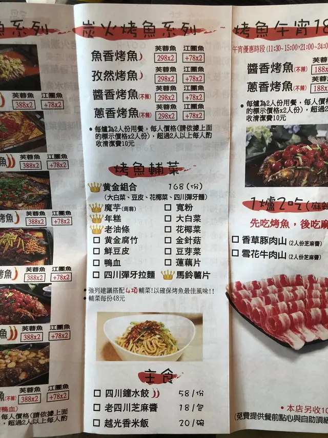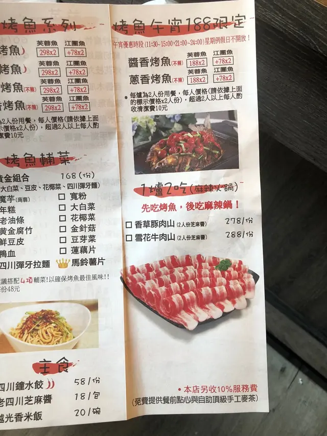 來看一下菜單吧,主打當然是重慶豆花烤魚388元*2(2人份)及十三香小龍蝦!如果不吃辣的朋友也不用擔心,這裡還有其他不辣的烤魚提供選擇,所以說大小朋友都可以一起用餐。此外還有一些麵類及單點火鍋料搭配享用~