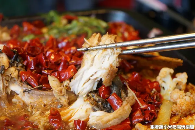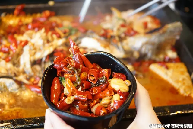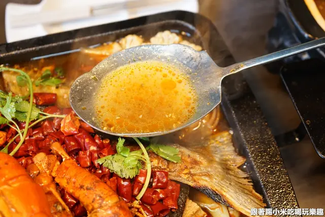 剛上桌時建議先等待3分鐘以上才開始食用,讓這個採用十八種四川與貴州辣椒精煉而成的麻辣醬與高湯融為一體,而且小米聽店長介紹1隻烤魚限定配上4種配菜,不能多也不能少,低於4種烤魚就無法吸收配菜蔬果鮮美。如果超過4種配菜又會搶了烤魚的味道。