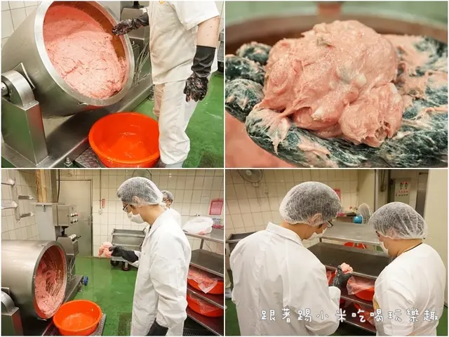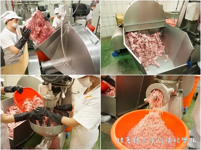 聽廠長說他們摃丸製作很簡單, 就是使用屠宰場現殺處理後快速冷凍豬肉切片.絞肉.加入調味料豬油香菇打成肉漿.再擠摃丸煮熟.機器X光機檢查摃丸.包裝進入冷凍庫~ 所以並沒有加入其他成份來降低豬肉比例, 難怪吃起來口感是有肉汁彈牙 以下是機台先將豬肉塊切片再進行絞肉. <<大家可以先看影片整個過程全記錄>>
