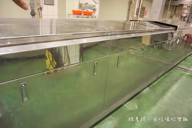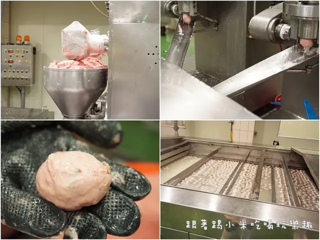 打好肉漿會被送到另一個區塊, 使用這台機器自動擠摃丸, 超神奇的XD 就好像是一台生雞蛋機器, 摃丸會一顆一顆自動擠出來, 之後經過長長"熱水長河"煮熟後再送去風乾進行包裝囉~
