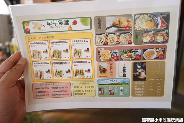 來看看菜單吧!招牌厚吐司系列單點70元~110元,而且份量很多~其他還有蛋餅及日式炒麵,但提醒因為是現點現做需要等候,建議先打去去預訂再過去現場內用或外帶囉。