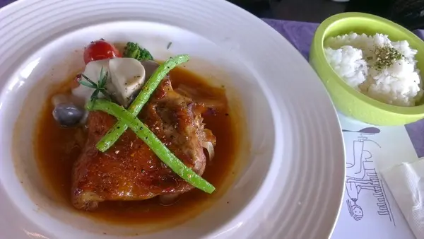必吃阿!!! 還有這一道餐點的貝果 也沒讓我失望!很特別的式沾醬友加入薰衣草香料唷!!!沾著一起吃 薰衣草的天然香氣加上美乃滋甜甜的味道~阿))) 人間美味.. 另外男友點的薰衣草蜜汁嫩雞 NTD300