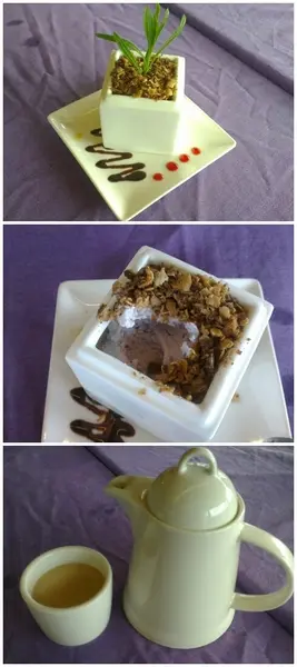 果然是嫩雞~很JUICY唷!! 有感受到這是一隻有在運動的雞 呵呵 阿咪陀佛她有搭配一碗白飯以及免費的紅醬/綠醬沾醬 (自助區)男友說綠醬辦飯還蠻好吃的 不過因為都是橄欄油 小女子指有淺嚐幾口 XD 另外我們又點了下午餐套餐~~也是必吃!!!香草盆栽下午茶!!!可以搭配160元飲品 或單點(80元)這個真的也是一般店家吃不到的美味!!!看看美圖是不是很可ㄞ壓)))) 這道甜點有三層秘密唷!