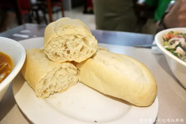 法國麵包是他們自己製作的, 麵包的皮是酥脆卻不會像一般法國麵包硬脆, 中間麵包很軟綿, 而且熱熱的吃可以吃到麵包香, 單吃就還不錯呢~