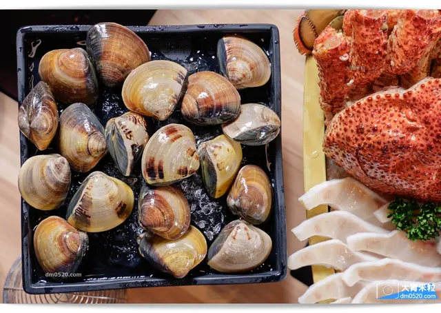 現切的台灣梅花豬/美國安格斯嫩肩里肌牛,還有肥美的蛤蠣飽滿鮮甜,推薦肉控或海鮮控更換!